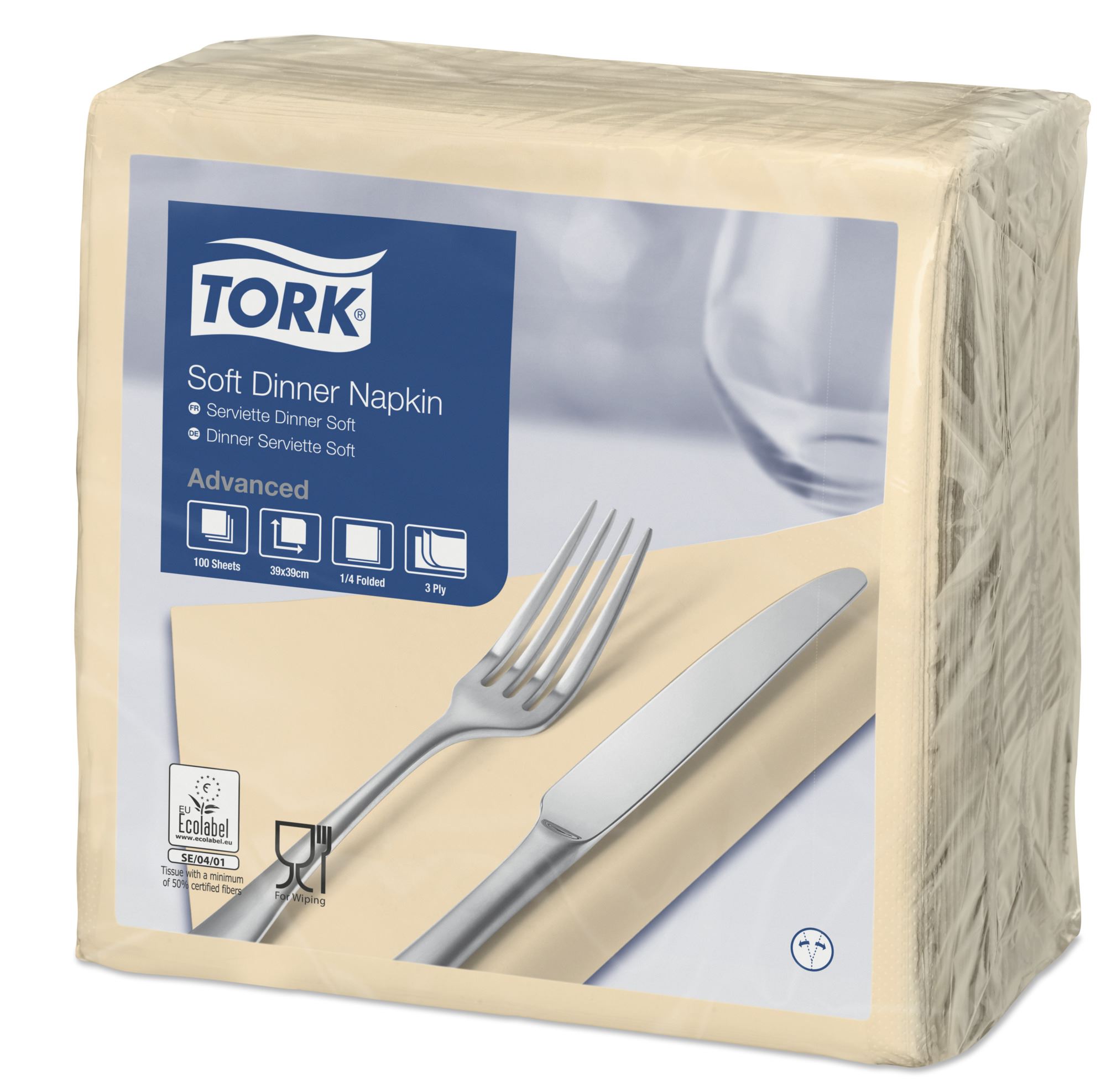 Tork plain ivory paper napkin, 3 ply. excellent quality and unrivaled hand feeling. The Tork towel is soft, absorbent and easy to fold. Excellent hold thanks to its triple thickness. Sold only in multiple layer pallets of 8 packages.