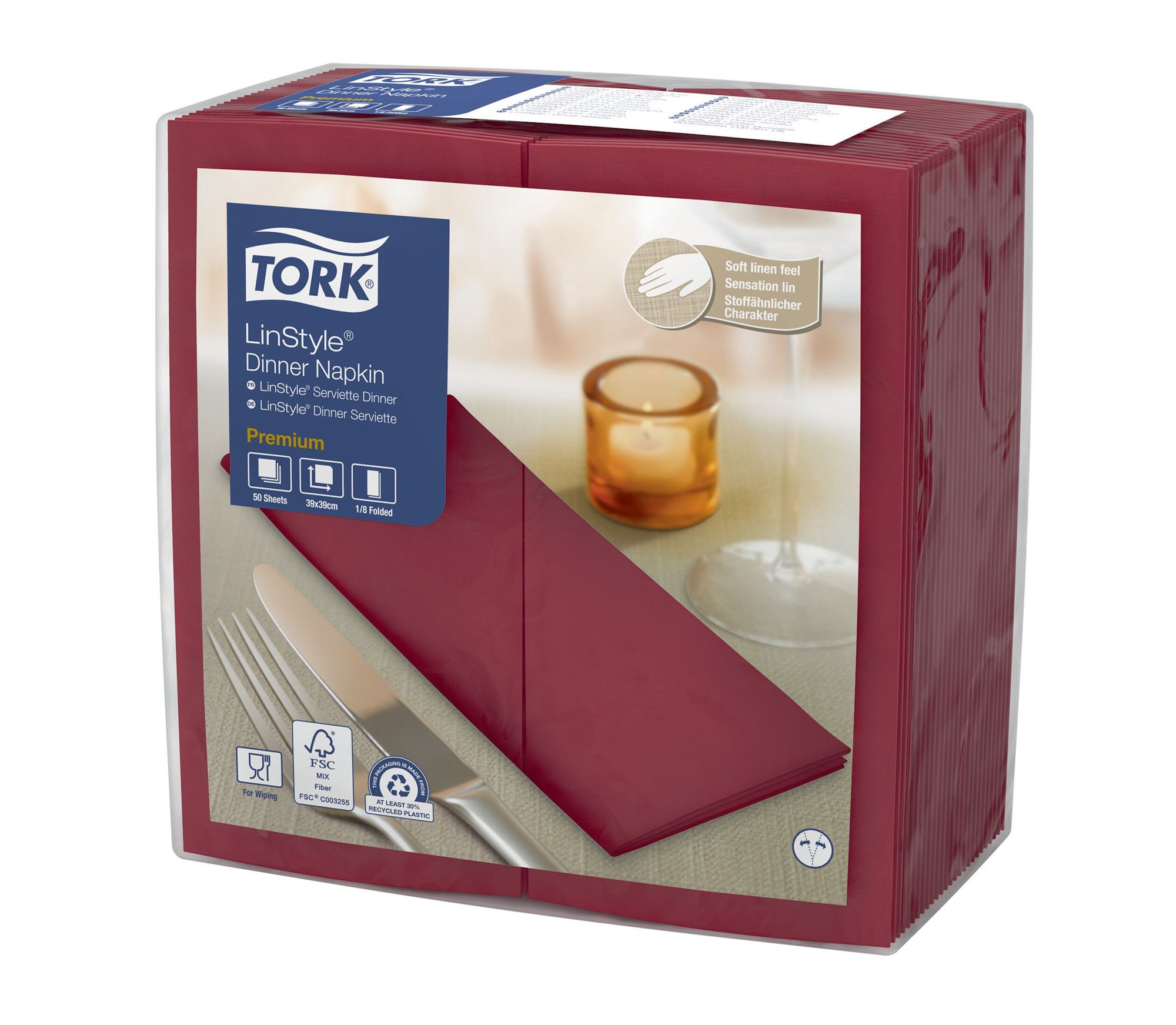 Tork LinStyle 8-fold burgundy napkin is ideal for restaurants, where quality is paramount. The 8-fold design allows for a more elegant table setting with cutlery. Tork LinStyle has the look and feel of soft, thick fabric.
