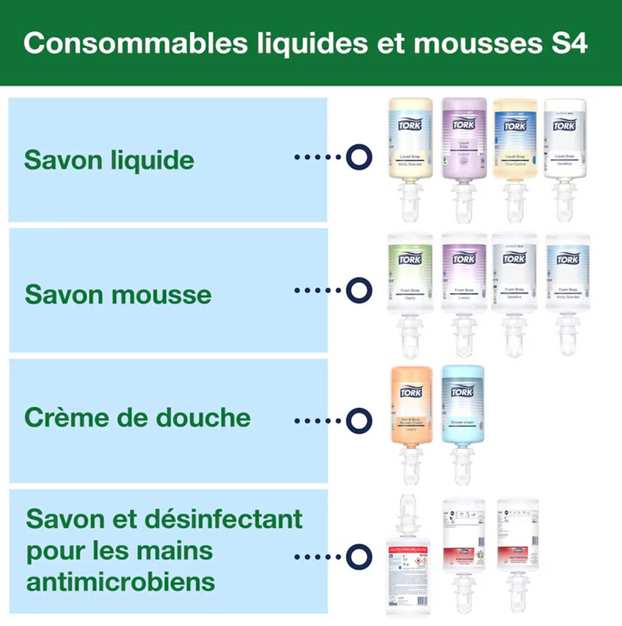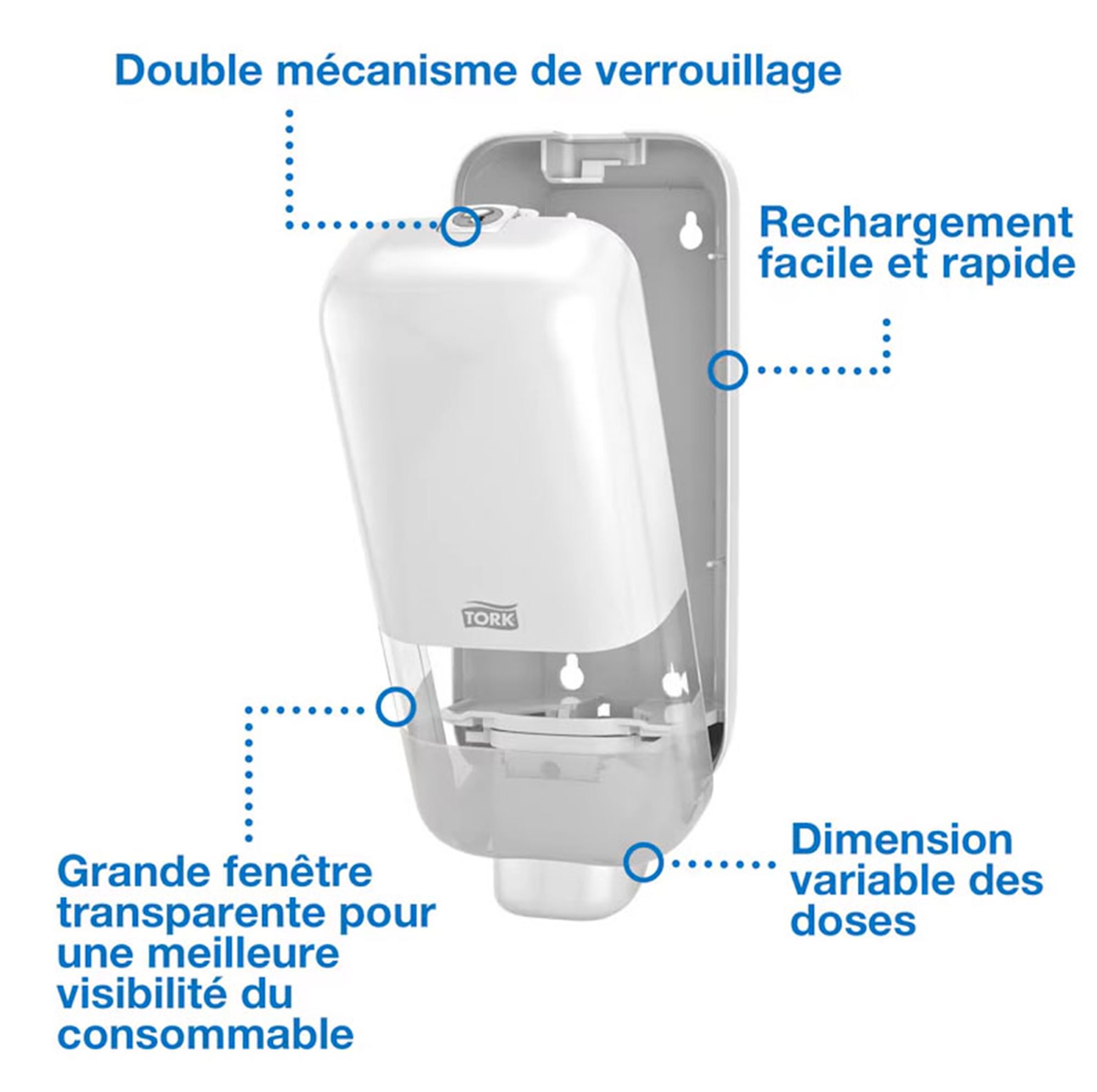 - Maximum versatility : compatible with several types of Tork soaps and disinfectants (foam, liquid, gel).