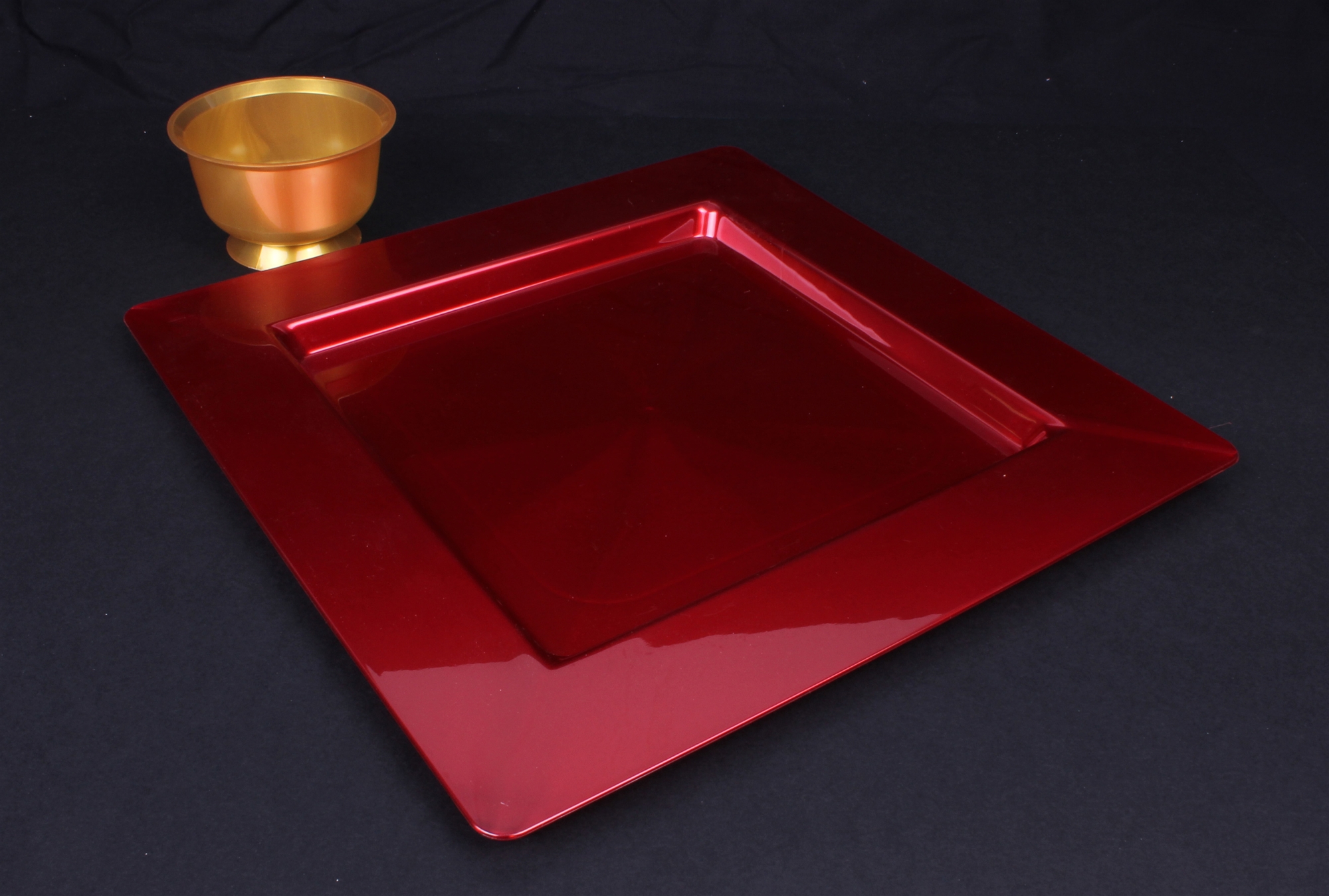 Reusable plastic underplate in carmine color, square shape 298x298 mm. Underplate made in France in PS. Reusable and food contact.