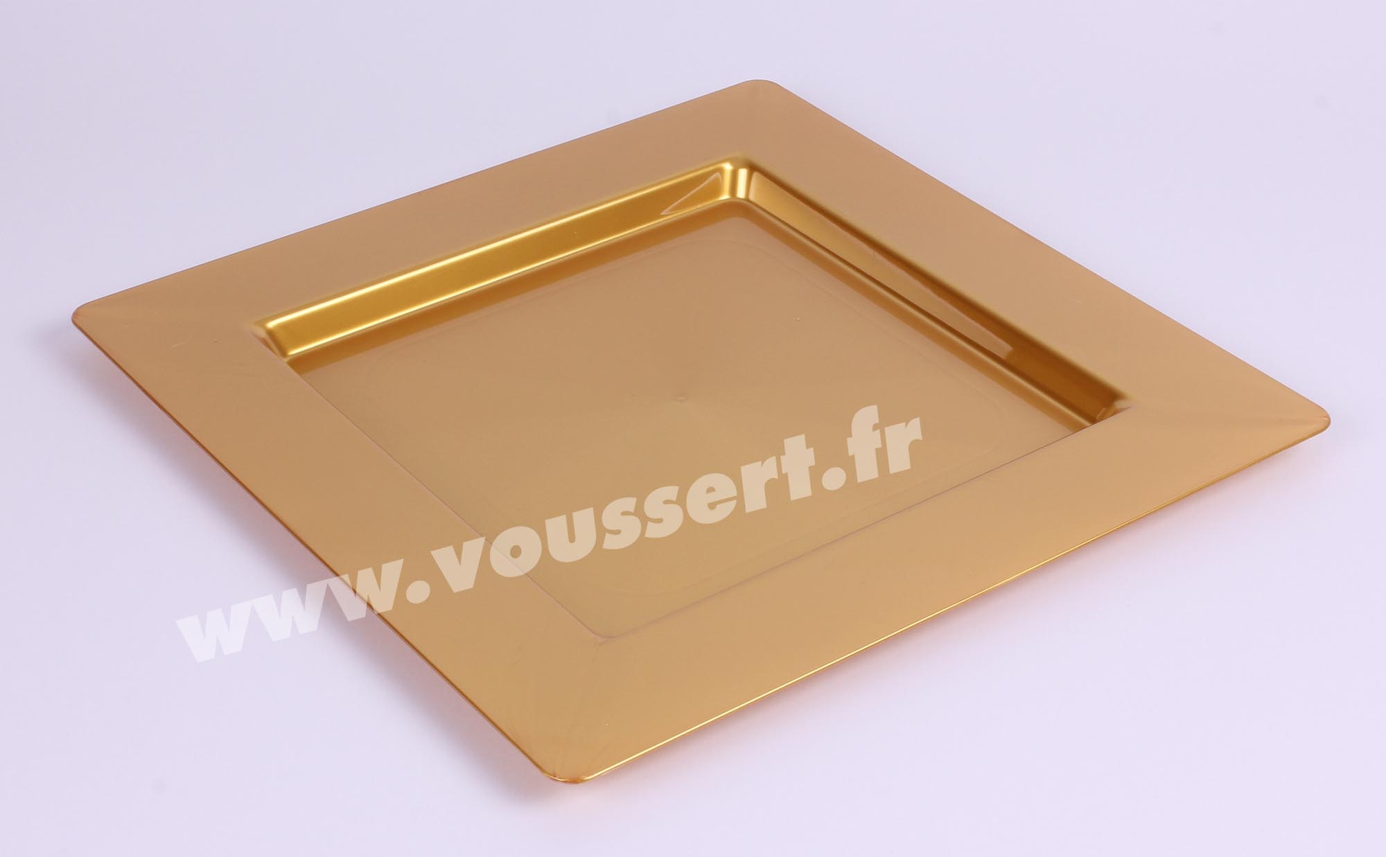 Reusable plastic underplate in gold color, square shape 298x298 mm. Underplate made in France in PS. Reusable and food contact.