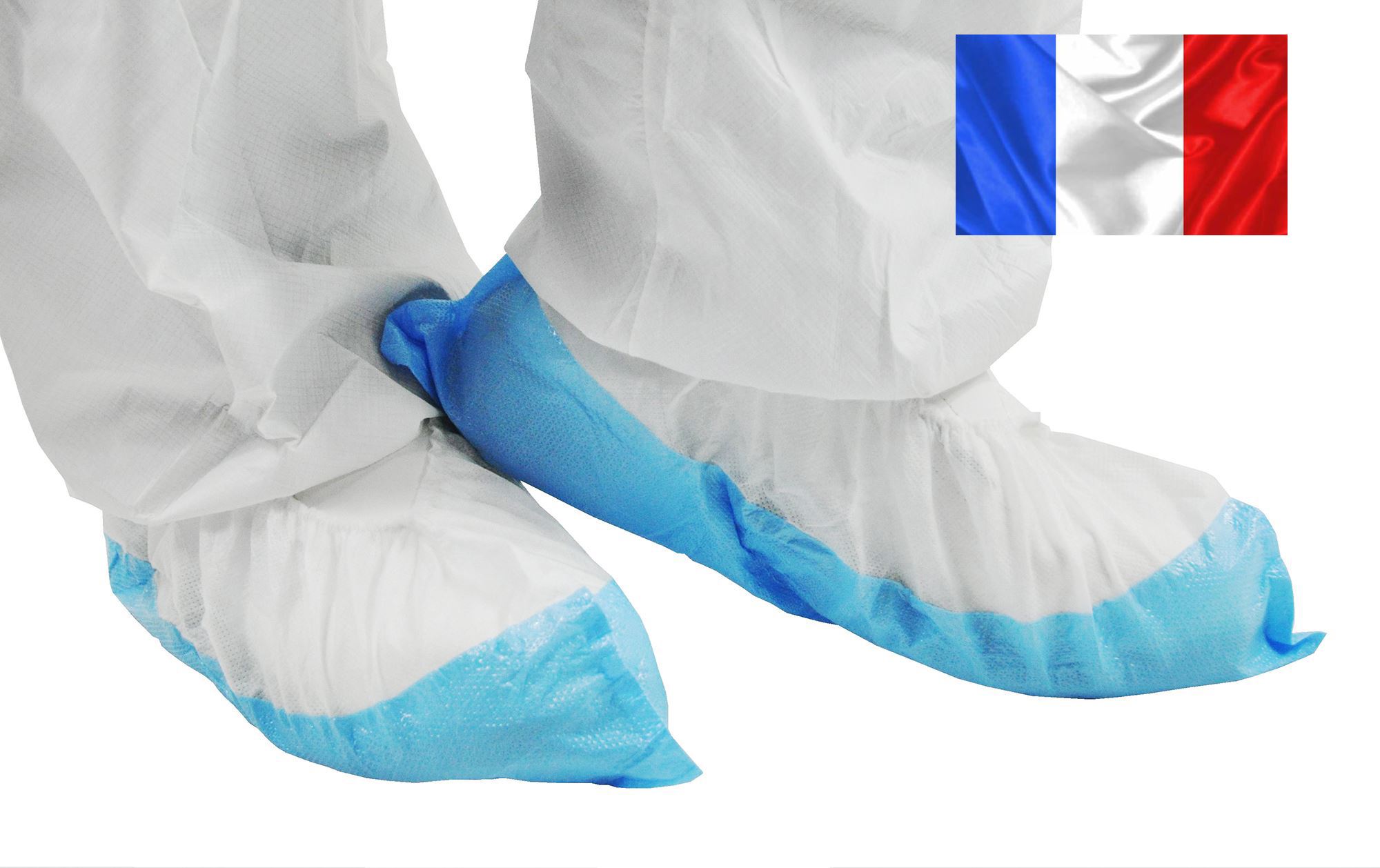 White polypropylene overshoe Safewear premium universal size X large. Reinforced blue plastic sole. Class I medical device made in France.