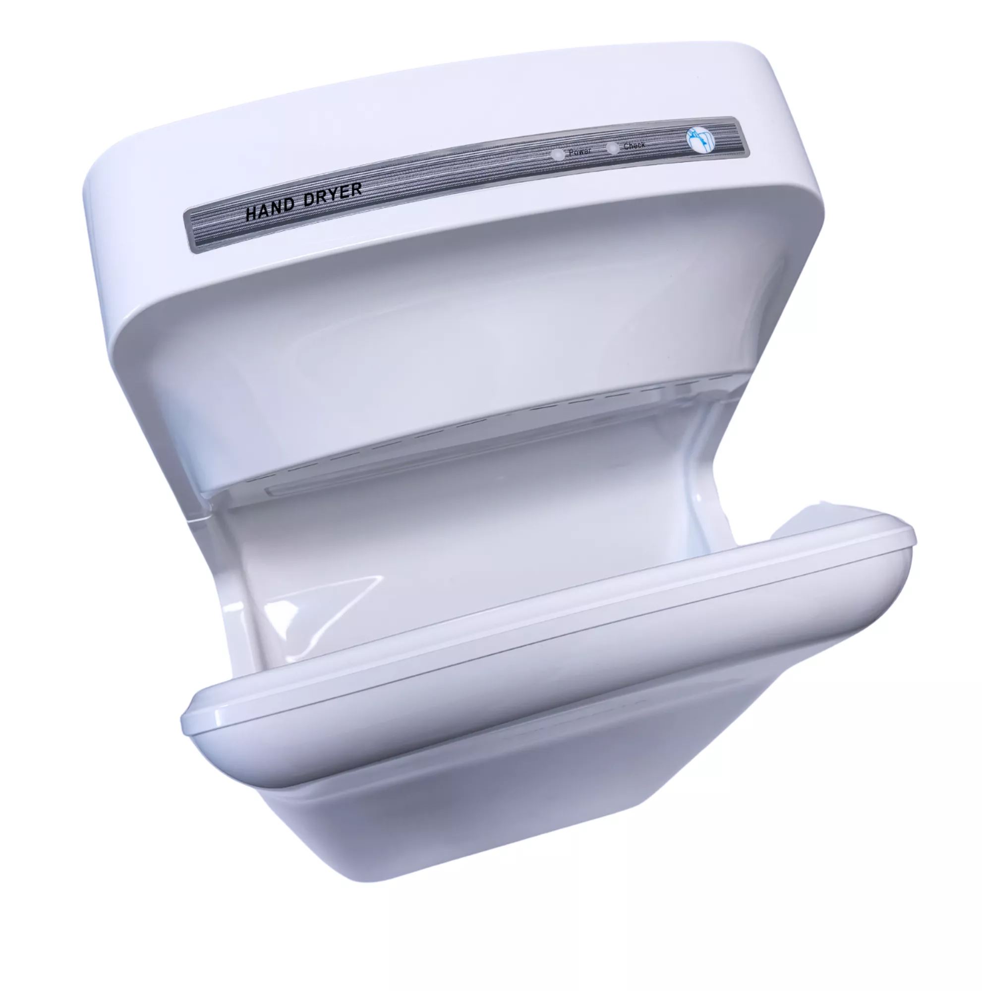 White vertical pulsed air hand dryer. Class II IPX4. CE and RoHS certified. Heating element. White ABS casing. Air speed 324 km/h. Drying time 7 to 10 seconds. Direct from manufacturer.